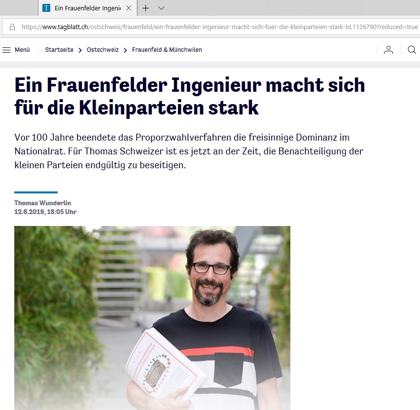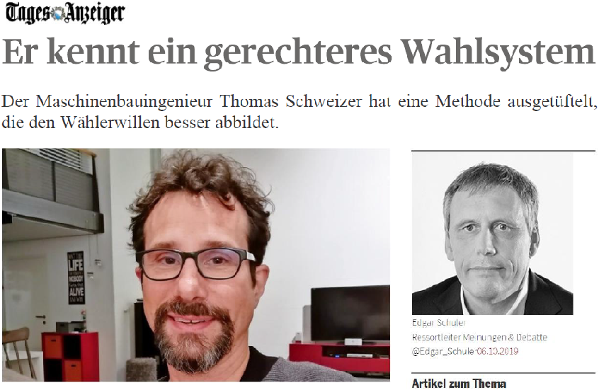 Sehr interessante Überlegungen mit ausführlichem Beschrieb gut verständlich, gründlich und nachvollziehbar recherchiert und geschrieben. Den Mut zu haben, ein 100jähriges Verfahren zu hinterfragen und einen neues, besseres Verfahren für das Proporzwahlsystem aufzuzeigen, zeugt von der Leidenschaft und Überzeugung des Autors, sich für ein gerechteres Wahlverfahren einzusetzen! Ich hoffe, es wird umgesetzt!